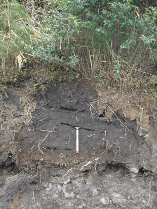 露頭最上部の黒っぽい部分は過去100年間に降り積もった火山灰の地層です.