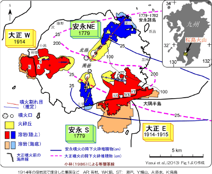 - http://www.kazan-g.sakura.ne.jp/J/koukai/01/kobayashi.html Yasui, M., Takahashi, M., Shimada, J., Ishihara,K and Miki,D.(2013) Comparative study of proximal eruptive events in the large-scale eruptions of Sakurajima Volcano: the An-ei vs. Taisho eruption. Submitted to the special issue of Sakurajima Volcano, Bull. Volcanol. Soc. Japan. 58, 59-76.
