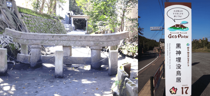 桜島東部の黒神地区で保存されている埋没鳥居です.桜島・錦江湾ジオパークのジオサイト17番になります.