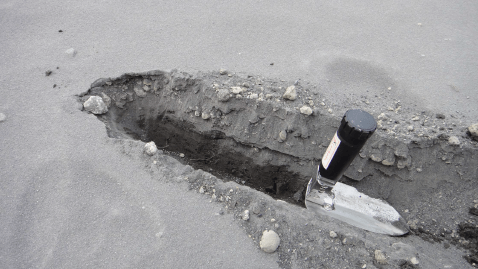 地面を少し掘ってみると,火山灰が厚く堆積していることがわかります.